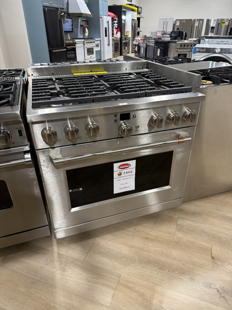 OUTLET CENTER ITEM - This Café commercial style range is inspired by professional kitchens, so you can entertain crowds of any size. Enjoy unmatched versatility with a cooktop that has it all, from Inspiral and Multi-Ring burners that evenly heat any cookware, to Griddle Zone burners—the perfect grilling accessory. The Caterer’s Oven fits a full-size catering pan and comes complete with Precision Cooking modes and an accompanying temperature probe for stunning results, no matter the dish.Read More