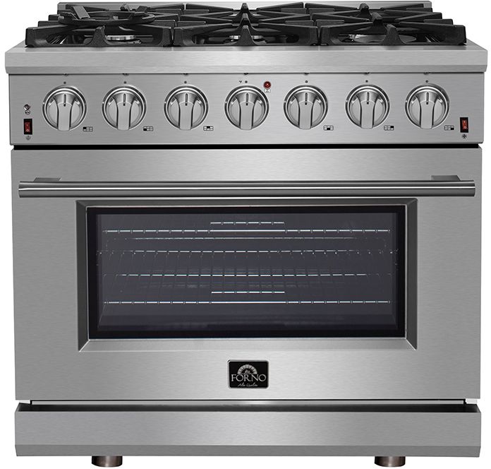 The Forno Massimo 36 Inch Gas Range harmonizes professional style and 304-grade stainless steel durability. Its 6 sealed burners, totaling 83,000 BTU, include a precision 20,000 BTU dual-ring burner that can simmer at 1,000 BTU. Continuous cast iron grates ensure stability on the enamel surface. The 5.36 cu.ft. convection oven, with a blue enamel interior and 3-layer glass window, reaches 30,000 BTU for versatile cooking. It features 2 telescopic racks, an air fryer kit, a wok support, a reversible griddle, an LP conversion kit, and durable zinc-coated metal knobs. Elevate your kitchen with performance, convenience, and enduring elegance.Read More