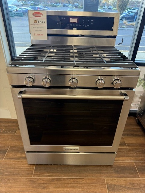 OUTLET CENTER ITEM - DOYLESTOWN - This beautiful gas freestanding range produces flawless cooking results with Even-Heat™ True Convection. The unique bow-tie design and convection fan ensure the inside of the entire oven is heated to, and stays at, the perfect temperature. The oven is 5.8 cu ft., providing a large capacity that’s perfect for preparing multiple dishes at once. The cooktop has 5 burners ranging from 5,000 to 18,000 BTU, letting you go from a rolling boil to a delicate simmer.Read More