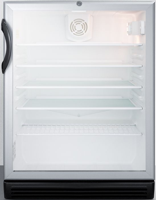 SUMMIT COMMERCIAL's SCR600BGLBIADA Series features 32" high beverage refrigerators designed and manufactured in Europe for built-in installation under lower ADA compliant counters in commercial settings. The SCR600BGLBIADA comes in a convenient 24" footprint with a generous 5.5 cu.ft. capacity. It has a front-breathing design for built-in installation and a fully finished black cabinet that also allows freestanding use. The user-reversible door features double pane tempered glass for added protection, with a brushed aluminum finish on the frame. The factory-installed front lock is located towards the top of the door for easier access. Inside, the SCR600BGLBIADA includes four adjustable glass shelves for spill-proof storage and a half-sized wire shelf ideal for holding bottles in place. Automatic defrost ensures minimum user maintenance and a dial thermostat makes it simple to manage the temperature. This unit features an interior light operated with an ON/OFF rocker switch and a white interior finish to ensure optimum product visibility. Our unique "hidden" evaporator is located in the rear wall to help protect the unit's system and maximize shelf space. An internal fan helps to ensure the interior is more evenly cooled from top to bottom. Made in Europe, the SCR600BGLBIADA is ETL-S listed to NSF-7 commercial standards. With its ADA compliant design, this unit is the perfect choice for any setting in need of a reliable commercial display refrigerator that fits in ADA compliant applications. Additional handle styles are available.