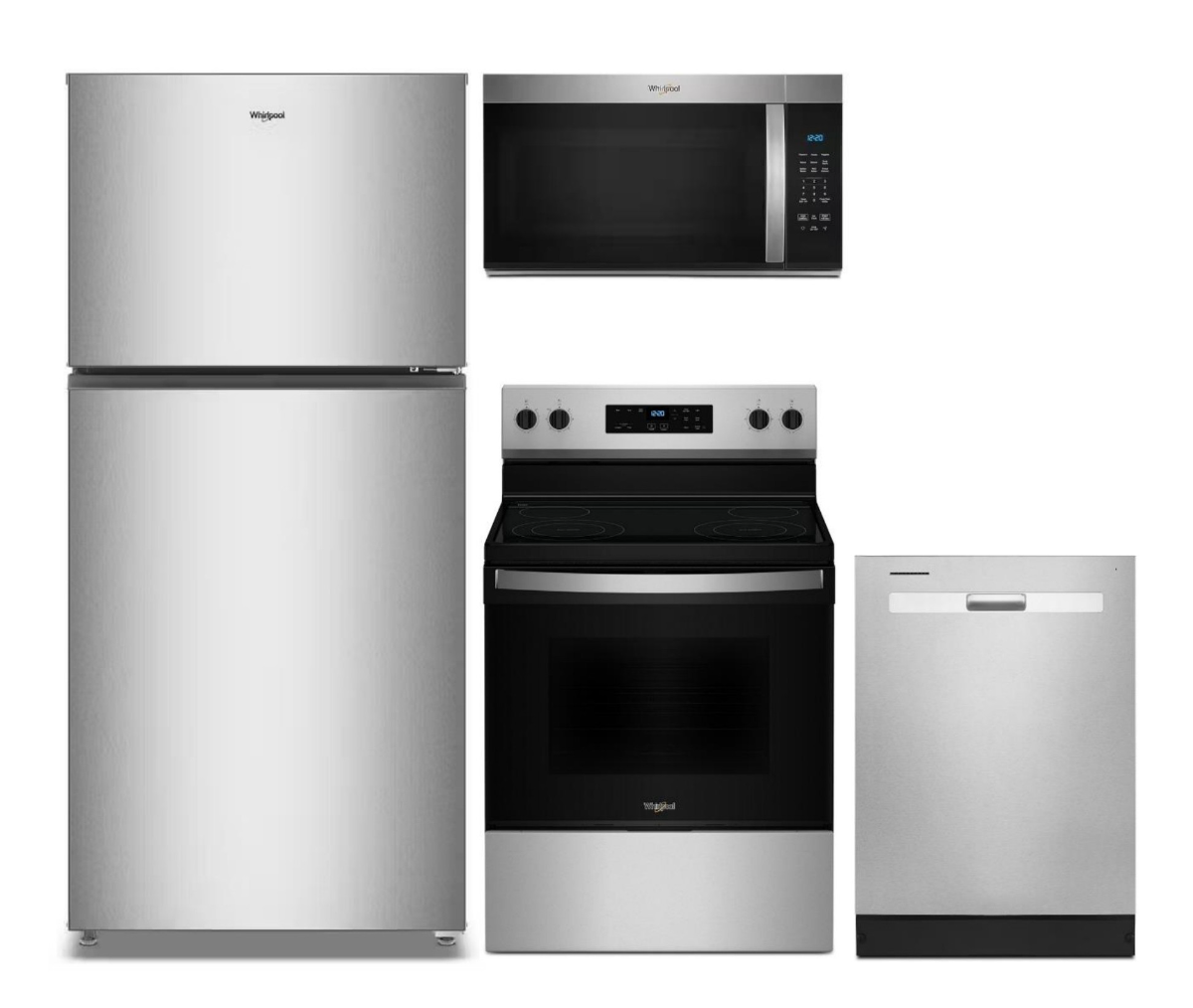 Whirlpool® 30" 19.3 Cu. Ft. Fingerprint-Resistant Stainless Finish Top Freezer Refrigerator with Total Coverage CoolingWhirlpool® 1.7 Cu. Ft. Stainless Steel Over the Range MicrowaveWhirlpool® 30" Stainless Steel Freestanding Electric RangeWhirlpool® 24" Finger Print Resistant Stainless Steel Top Control Built In DishwasherRead More